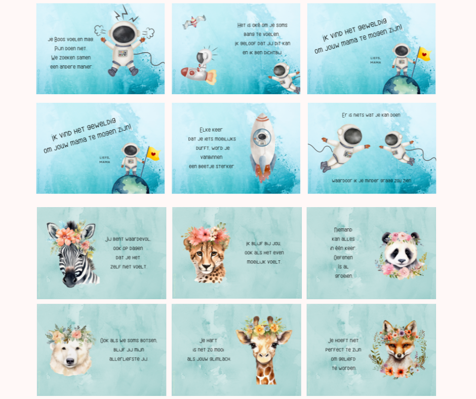 Elke kaart bevat een liefdevolle boodschap én een kleine levensles – licht verteerbaar, maar diep van betekenis.